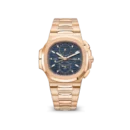 The Patek Philippe Nautilus Ref. 5990/1R-001 is the embodiment of technical ingenuity and refined elegance. Crafted in solid 18K rose gold with a captivating gradient blue sunburst dial, it unites three major complications — flyback chronograph, dual time zone, and date — within the iconic Nautilus silhouette. The result is a masterpiece that perfectly balances functionality, sophistication, and contemporary aesthetics.