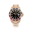 The Rolex GMT-Master II 126755SARU is the apex of haute gem-set watchmaking applied to a professional tool model. Crafted in 18K Everose gold and adorned with a bezel of alternating sapphires, rubies, and brilliant-cut diamonds, this exceptional piece merges the dual-time functionality of the GMT with haute joaillerie excellence. It is a rare statement of both utility and prestige.
